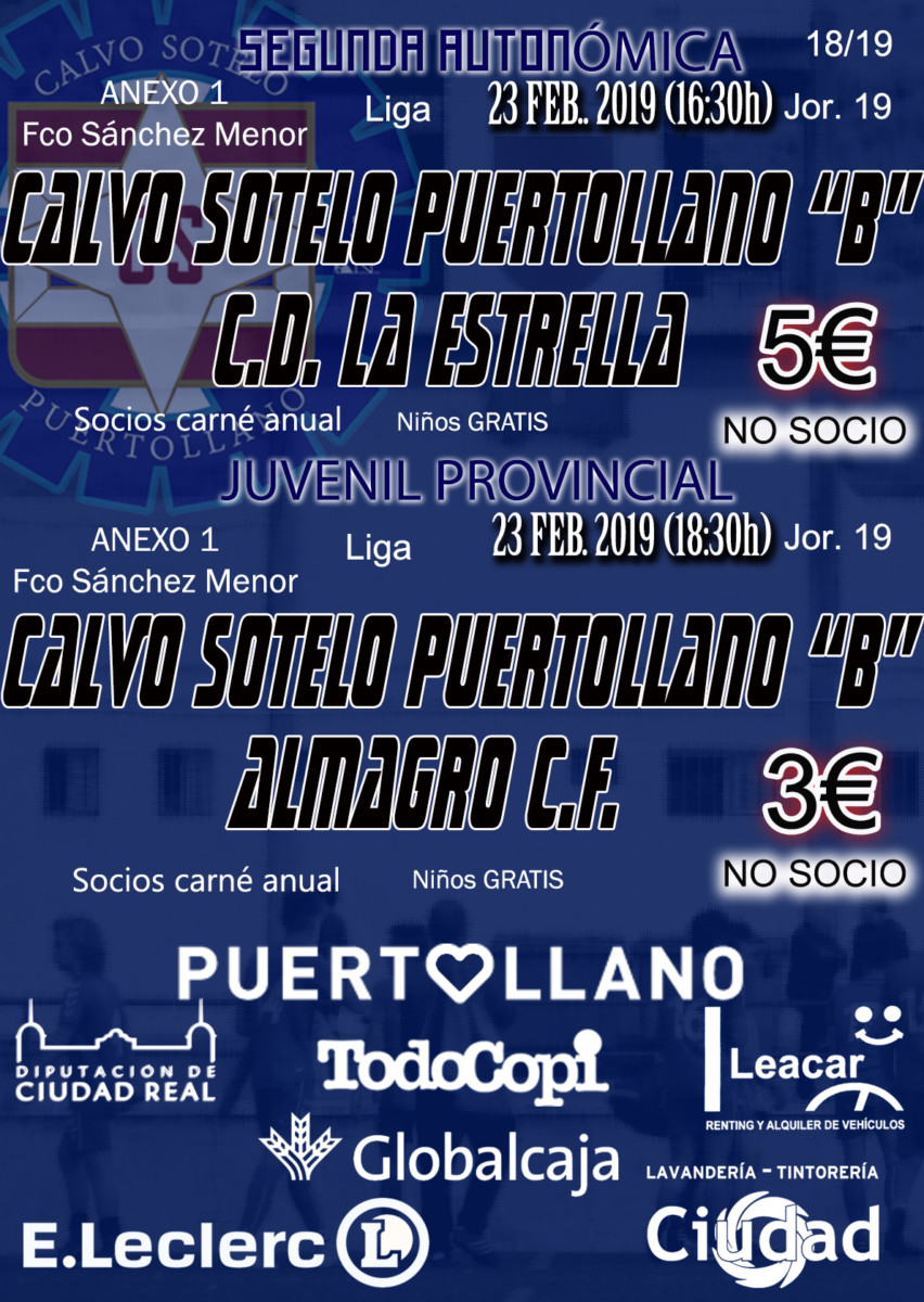 Partidos fin de semana.Resultados 23/Feb/2019 Calvo Sotelo Puertollano C.F. 1-0 C.D.Villacañas. Domingo 24, 17:00h.