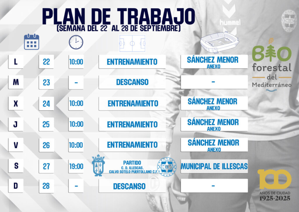 Infografía correspondiente al plan de trabajo de la semana del 23-28 de septiembre, preparación del encuentro C.D. Illescas – Calvo Sotelo Puertollano C.F.
